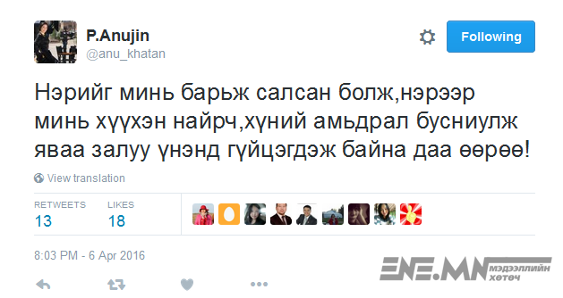 Харин экс нөхөр нь гэх А.Эрдэнэбатыг мэдээлэл хийсэнтэй холбогдуулж П.Анужин өнөөдөр твиттерт, "Нэрийг минь барьж салсан болж, нэрээр минь хүүхэн найрч, хүний амьдрал бусниулж яваа залуу үнэнд гүйцэгдэж байна даа өөрөө!" хэмээн жиргэжээ.