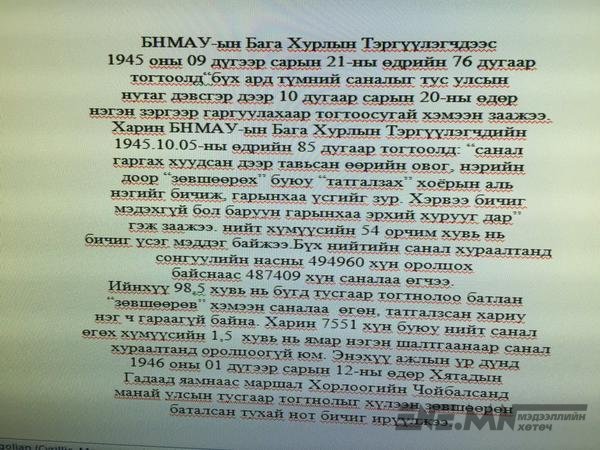 1945 оны 10 дугаар сарын 20-нд монголчууд санал асуулгаар тусгаар тогтнолоо баталгаажуулснаас хойш 70 жил болж байна Гол мэдээ, Фото мэдээ 20-10-2015, 13:13 1249 Хуваалцах 1249 Хуваалцах Facebook Twitter Санал болгох 20-10-2015, 11:33 УИХ-ын дэд дарга, МАН-ын дарга М.Энхболдын мэндчилгээ… 6-05-2015, 15:28 МАН-ын удирдлагууд ахмад дайчдад тусгаар тогтнолын одон гардууллаа… 28-12-2014, 21:17 Дугаарын хязгаарлалт 29 болон ирэх сарын 1,2-нд үйлчлэхгүй… 26-11-2014, 11:46 МОНГОЛ УЛС АНХДУГААР ҮНДСЭН ХУУЛИА БАТАЛЖ, ТУСГААР ТОГТНОЛОО ДЭЛХИЙ ДАЯАР ТУНХАГЛАСАН ТҮҮХТ 90 ЖИЛИЙН ОЙН МЭНД ДЭВШҮҮЛЬЕ… 10-07-2014, 18:03 “UNITEL” хэрэглэгчдээ санал асуулгаар хулхидаж их хэмжээний мөнгө луйвардав уу?… Сэтгэгдэл АНХААРУУЛГА: Уншигчдын бичсэн сэтгэгдэлд www.ENE.mn хариуцлага хүлээхгүй болно. ХХЗХ-ны журмын дагуу зүй зохисгүй зарим үг, хэллэгийг хязгаарласан тул ТА сэтгэгдэл бичихдээ хууль зүйн болон ёс суртахууны хэм хэмжээг хүндэтгэнэ үү. Сэтгэгдэлтэй холбоотой санал гомдлыг 9318-5050 утсаар хүлээн авна.