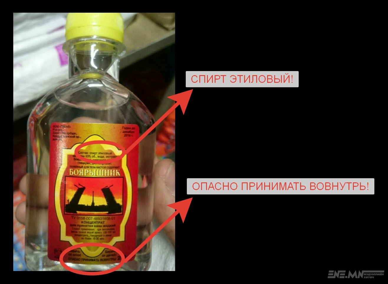 Уг бүтээгдэхүүнд метилийн спирт болон антифриз гэсэн хөлдөөх шингэн агуулагдсан бөгөөд шошгон дээр уухыг хориглоно гэсэн бичигтэй байсан хэдий ч хүмүүс авч хэрэглэсэн байна.