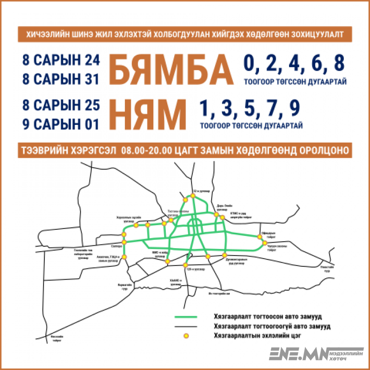 • - Улсын дугаар нь ТЭГШ тоогоор (0, 2, 4, 6, 8) төгссөн автомашин наймдугаар сарын 24, 31-ний бямба гарагт замын хөдөлгөөнд оролцоно.