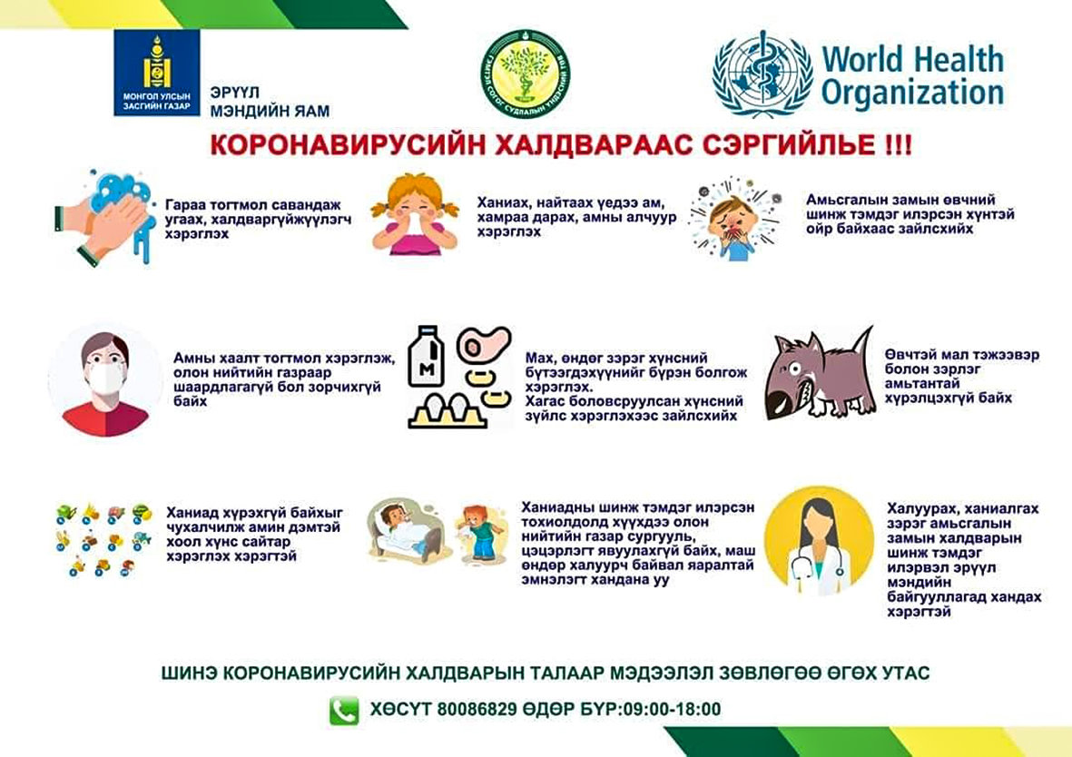Монгол Улсад коронавирусийн халдвар бүртгэгдээгүй байгаа ч ХӨСҮТ-д 50 ор бэлдсэн бөгөөд халдвар илэрсэн тохиолдолд нэмж гаргах 150 орыг нөөцлөөд байна. Элдэв худал мэдээлэл, тарааж ард түмнээ битгий төөрөгдүүлээч гэж нийт иргэдээсээ хүсэж байна. Эрүүл мэндийн яамнаас өгч буй мэдээ, мэдээллийг үзэхийг уриалж байна.
