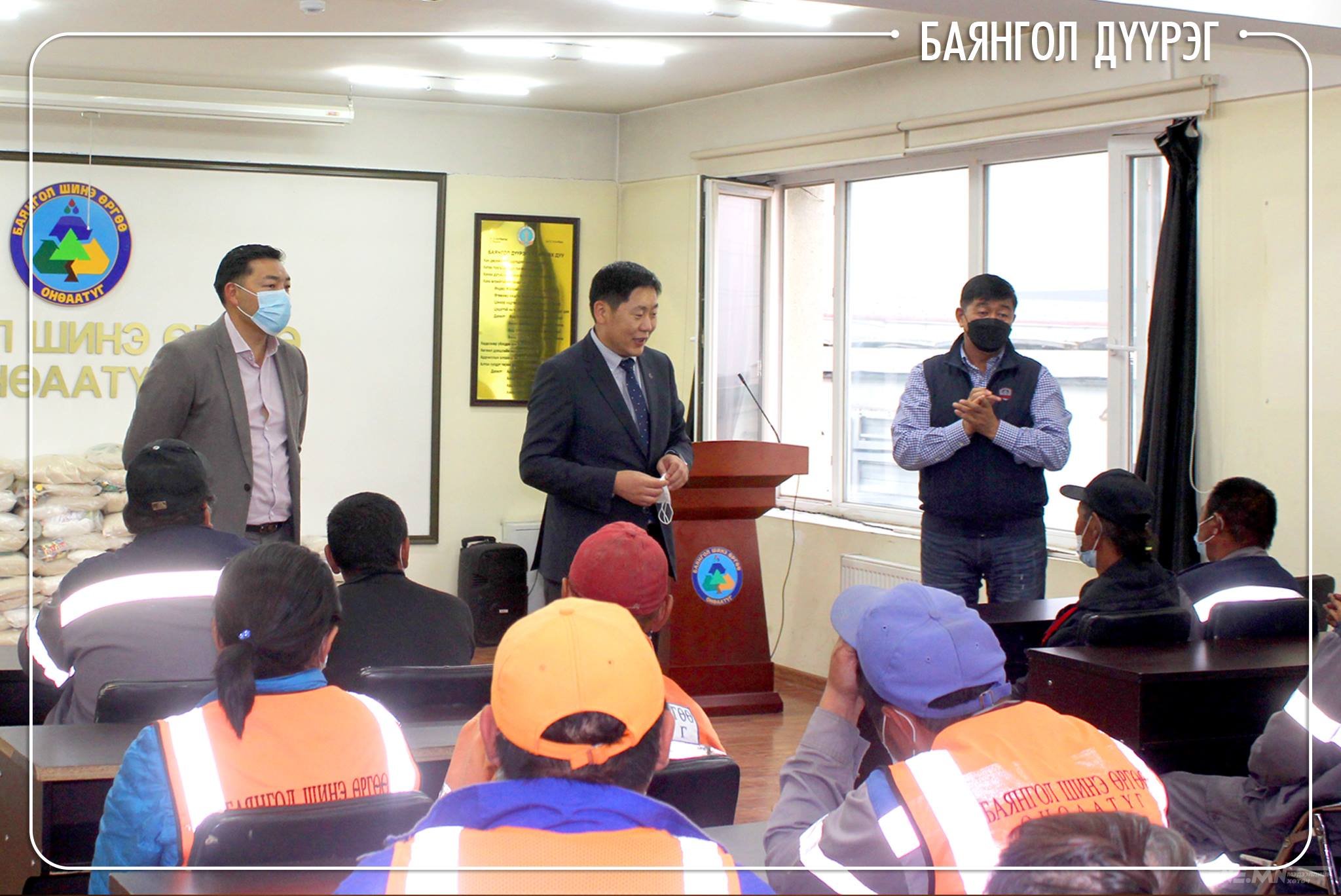 Түүнчлэн дүүргийн Засаг дарга тус газарт ажиллах үеэрээ "Баянгол шинэ өргөө”-гийн ажилтан, албан хаагчдад 3000 амны хаалт мөн ТҮК-ийн 116 ажилтанд хүнсний багц олгох дэмжлэг үзүүлснээ хүлээлгэж өгсөн юм.