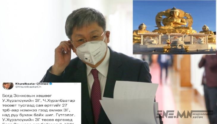 Тэрбээр "Богд Зонховын хөшөөг У.Хүрэлсүхийн Засгийн газар, Ч.Хүрэлбаатар төсөвт тусгаад сая өртгийг 27 тэрбумаар нэмжээ гээд өмнөх Засгийн газар, над руу бухаж байх шиг. Гүтгэлэг. У.Хүрэлсүхийн Засгийн газар төсөв өргөхөд Богд Зонхова огт байгаагүй. УИХ дээр гурван гишүүний саналаар нэмэгдсэн, ТБХ өртөг нэмээгүй гэдгийг хэлье” гэжээ.