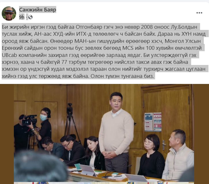 С.Баяр "Би жирийн иргэн гээд байгаа Отгонбаяр гэгч энэ нөхөр 2008 оноос Лу.Болдын туслах хийж, АН-аас ХУД-ийн ИТХ-д төлөөлөгч ч байсан байх. Дараа нь ХҮН намд ороод явж байсан. Өнөөдөр МАН-ын гишүүдийн өрөөгөөр хэсч, Монгол Улсын Ерөнхий сайдын орон тооны бус зөвлөх бөгөөд MCS ийн 100 хувийн өмчлөлтэй UBcab компанийн захирал гээд өөрийгөө зарлаад явдаг. Би улстөрждөггүй гэх хэрнээ, хаана ч байхгүй 77 тэрбум төгрөгөөр нийслэл такси авах гэж байна хэмээн ор үндэсгүй худал мэдээлэл тараан олон нийтийг турхирч жагсаал цуглаан хийнэ гээд улс төржөөд явж байна. Олон түмэн тунгаана биз" гэв.