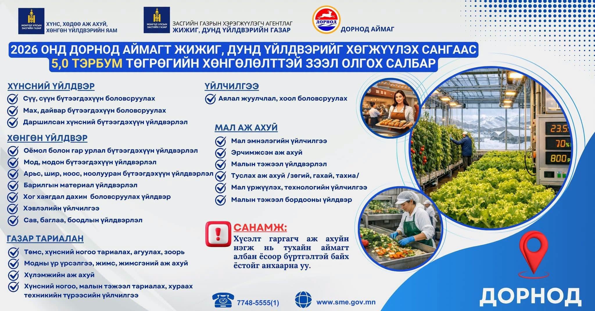 Дорнод аймагт 2026 онд жижиг, дунд үйлдвэрийг хөгжүүлэх сангаас 5,0 тэрбум төгрөгийн хөнгөлөлттэй зээл олгохоор төслийг хүлээн авч эхэллээ Нийгэм Өнөөдөр, 10:47 19 Хуваалцах Жижиг, дунд үйлдвэрийг хөгжүүлэх сангаас 2026 онд орон нутгийн болон сангийн хамтарсан санхүүжилтийн эх үүсвэрээр жижиг, дунд үйлдвэр, үйлчилгээ эрхлэгчдэд дэмжлэг үзүүлэх зорилгоор Хүнс, хөдөө аж ахуй, хөнгөн үйлдвэрийн яам, Жижиг, дунд үйлдвэрийн газар/SME Agency of Mongolia болон Дорнод аймгийн Засаг даргатай “Зээлийн ерөнхий нөхцөл тохиролцох, хамтран ажиллах гурван талт гэрээ”-г байгуулсан. Үүний дагуу Засгийн газрын 2020 оны 113 дугаар тогтоолоор батлагдсан “Жижиг, дунд үйлдвэрийг хөгжүүлэх сангаас хөнгөлөлттэй зээл олгох, сонгон шалгаруулах, дамжуулан зээлдүүлэх, эргэн төлүүлэх, хяналт тавих журам”-ын дагуу бичил үйлдвэр, үйлчилгээ эрхлэгчийн зээлийн хүсэлтийг цахим хэлбэрээр https://sme.gov.mn/login-аар дамжуулан хүлээн авах үйл ажиллагаа эхэллээ. ТӨСӨЛ ХҮЛЭЭН АВАХ ХУГАЦАА: Эхлэх: 2026 оны 04 дүгээр сарын 20-ны өдрийн 08:30 цагаас Дуусах: 2026 оны 05 дугаар сарын 19-ний өдрийн 17:30 цаг хүртэл ХӨНГӨЛӨЛТТЭЙ ЗЭЭЛИЙН НӨХЦӨЛ: Зээлийн зориулалт, хугацаа: Үндсэн хөрөнгийн зээл 8 жил, Эргэлтийн хөрөнгийн зээл 5 жил Зээлийн хүү : 5 хувь (жилийн) ХӨНГӨЛӨЛТТЭЙ ЗЭЭЛ ОЛГОХ САЛБАР. Хүнсний үйлдвэр Сүү, сүүн бүтээгдэхүүн боловсруулах; Мах, дайвар бүтээгдэхүүн боловсруулах; Даршилсан хүнсний бүтээгдэхүүн үйлдвэрлэл; Хөнгөн үйлдвэр Мод, модон бүтээгдэхүүн үйлдвэрлэл; Оёмол болон гар урлал бүтээгдэхүүн үйлдвэрлэл; Хог, хаягдал дахин боловсруулах үйлдвэрлэл; Арьс шир, ноос ноолууран бүтээгдэхүүн үйлдвэрлэл; Барилгын материал үйлдвэрлэл; Хэвлэлийн үйлчилгээ; Сав, баглаа, боодлын үйлдвэрлэл; Газар тариалан Төмс,хүнсний ногоо тариалах, агуулах, зоорь; Модны үр үрсэлгээ, жимс, жимсгэний аж ахуй; Хүлэмжийн аж ахуй Хүнсний ногоо, малын тэжээл тариалах, хураах техникийн түрээсийн үйлчилгээ; Мал аж ахуй Эрчимжсэн аж ахуй; Туслах аж ахуй /зөгий, гахай, тахиа/; Малын тэжээлийн үйлдвэрлэл; Мал эмнэлэгийн үйлчилгээ; Мал үржүүлэх технологийн үйлчилгээ; Малын тэжээл бордооны үйлдвэр; Үйлчилгээ Аялал жуулчлал, хоол боловсруулах. ЧИГЛЭЛ: Нийслэлээс орон нутагт шилжин үйлдвэр, үйлчилгээ эрхлэгч аж ахуйн нэгж, орон нутагт шилжсэн иргэнийг ажилд авсан үйлдвэр, үйлчилгээ эрхлэгч аж ахуйн нэгж; Импортыг орлох шинэ бүтээгдэхүүн үйлдвэрлэл; Инновацийн бүтээгдэхүүн нэвтрүүлэх; Хүнсний түүхий эдийн бэлтгэн нийлүүлэлтийн сүлжээнд оролцогч; Цагаан алт хөдөлгөөн; Атар-4 тариалангийн тогтвортой хөгжлийн аян; Бүсчилсэн хөгжлийн үзэл баримтлал. ХОЛБОО БАРИХ УТАС: 77485555-1 Жижиг, дунд үйлдвэрийн газрын Зээл, төслийн газар. Дорнод аймгийн Хүнс, хөдөө аж ахуйн газар70585111 , 80368080 Жижиг, дунд үйлдвэрийн газар/SME Agency of Mongolia 19 Хуваалцах Facebook Twitter Санал болгох 22-02-2024, 15:25 Голомт банк “Хүнсний болон хөдөө аж ахуйн үйлдвэрлэлийг дэмжих зээл”-ийн хүсэлтийг хүлээн авч эхэллээ… 23-02-2021, 13:36 Голомт банк “Ажлын байрыг дэмжих” 3%-ийн хүүтэй зээлийн хүсэлтийг онлайнаар авч эхэллээ… 30-11-2020, 17:55 “Бичил зээлийн багц”-аас 64 төсөлд зээл олгохоор боллоо… 30-11-2020, 17:52 Төсөл сонгон шалгаруулах хорооны хуралд 112 төсөл танилцууллаа… 12-04-2019, 14:16 ЖДҮХ САНГААС ЗЭЭЛ ОЛГОХ ТӨСӨЛ СОНГОН ШАЛГАРУУЛАХ ЖУРМЫН ТӨСӨЛД ӨӨРЧЛӨЛТ ОРУУЛЖЭЭ… Сэтгэгдэл АНХААРУУЛГА: Уншигчдын бичсэн сэтгэгдэлд www.ENE.mn хариуцлага хүлээхгүй болно. ХХЗХ-ны журмын дагуу зүй зохисгүй зарим үг, хэллэгийг хяз